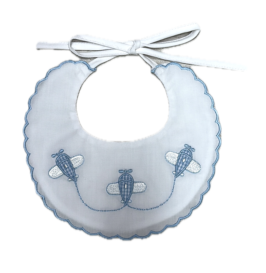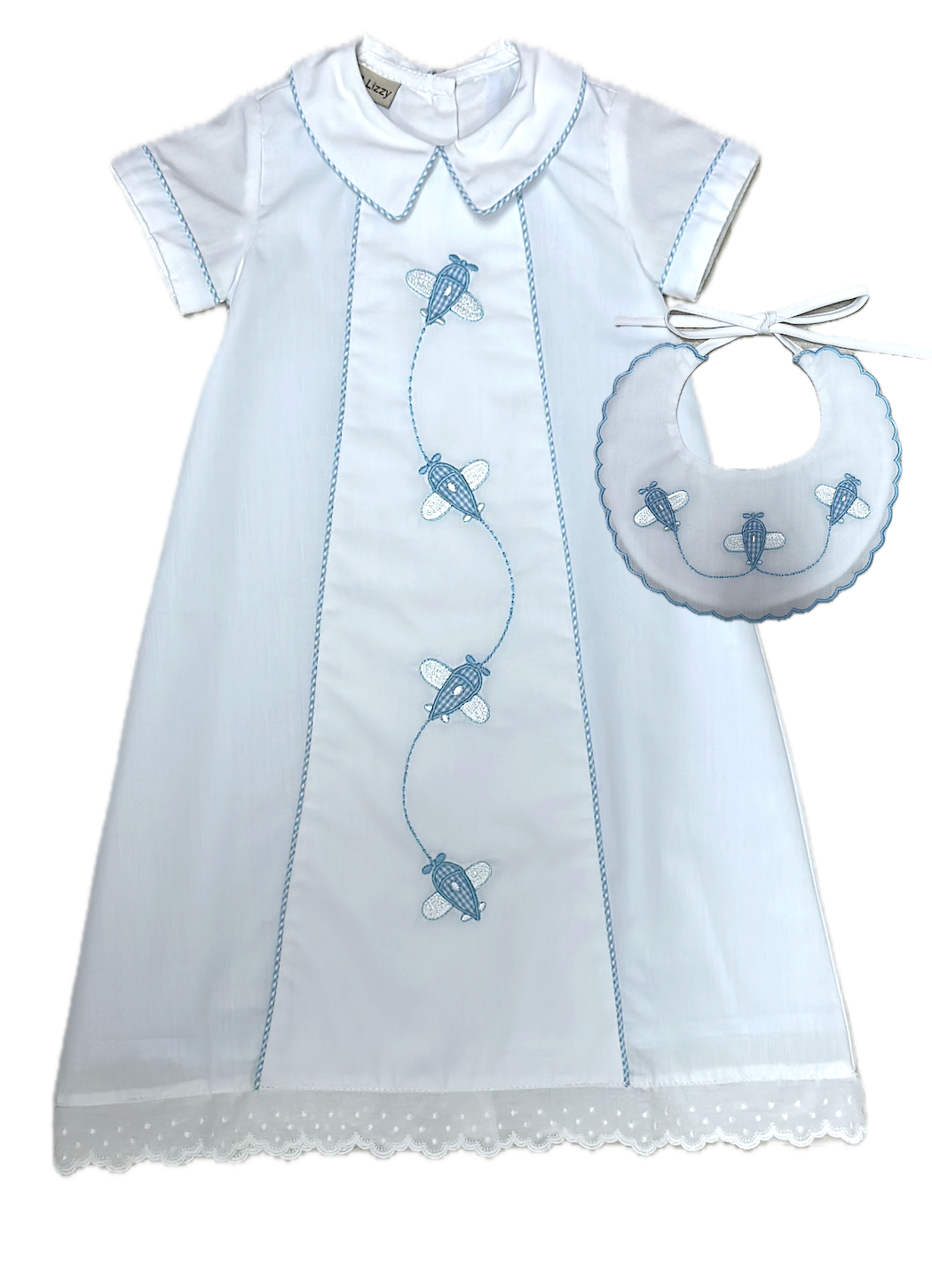 Airplanes daygown set ( bib and hat). Image is missing the hat. Cotton/polyester blend. Made in El Salvador
