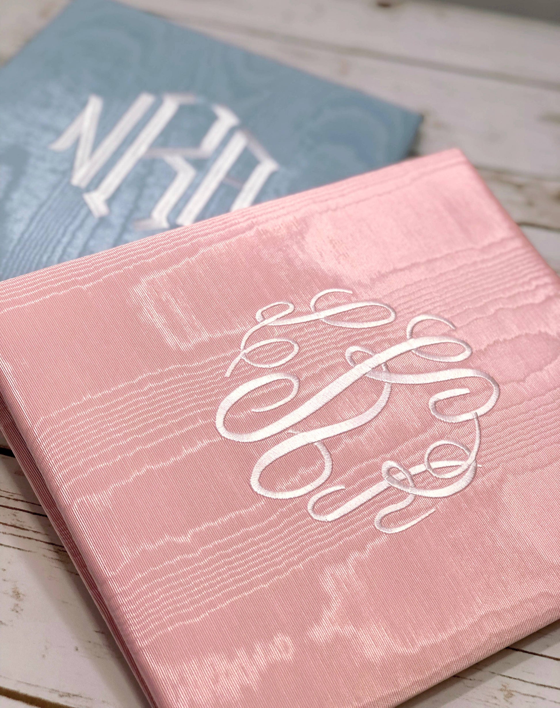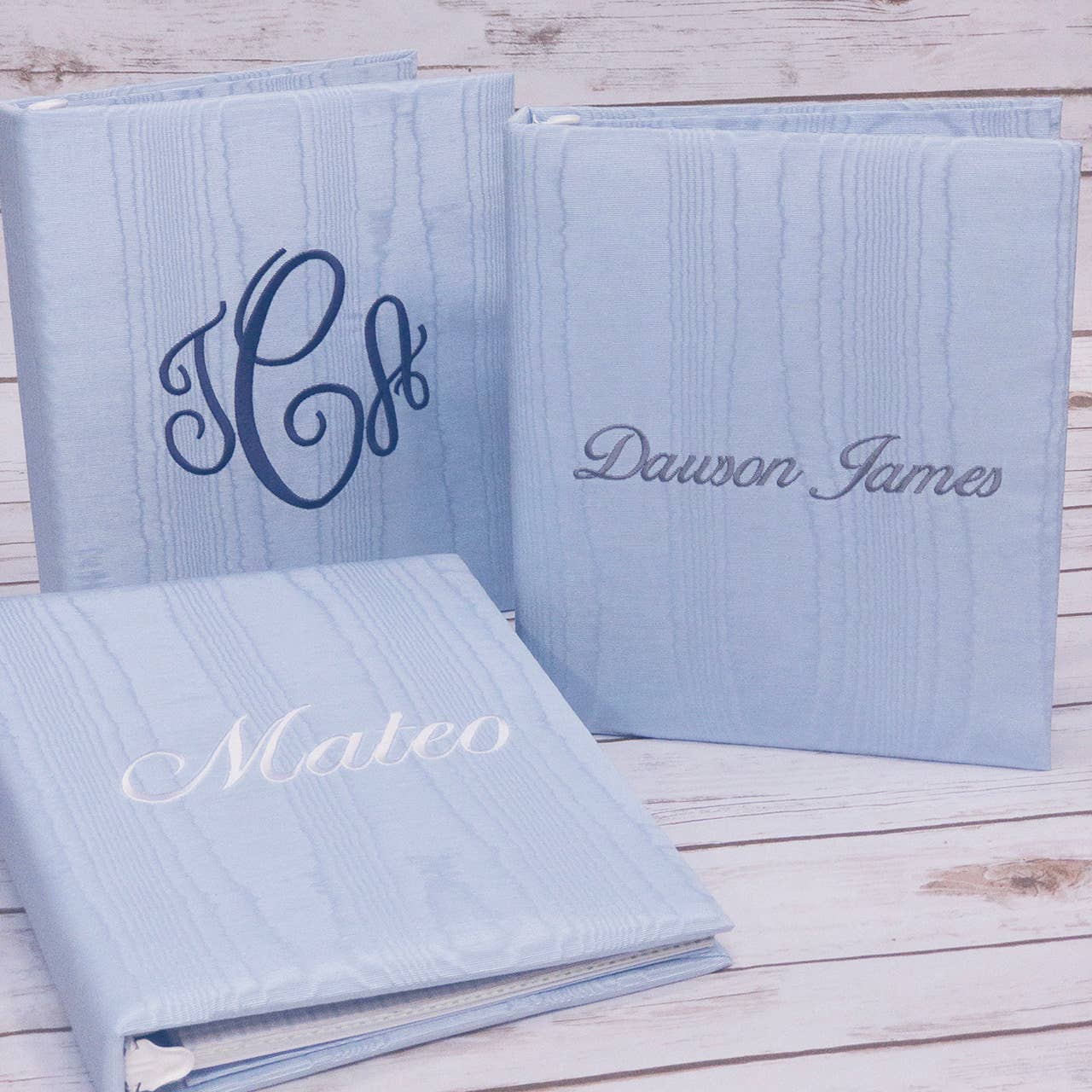 Monogramming Available! Our Baby Moire is a fine fabric that has a wavy, watered appearance, assuring that every cut is unique - just like your memories. Available in all the moire colors. This fabric covered three-ring binder measures 10″ x 11.75″ and includes a set of 66 adorably illustrated pages to record important events, as well as 14 blank pages where you can add in additional memories. Personalize with a name, monogram or initials. See Gallery for font and thread options.