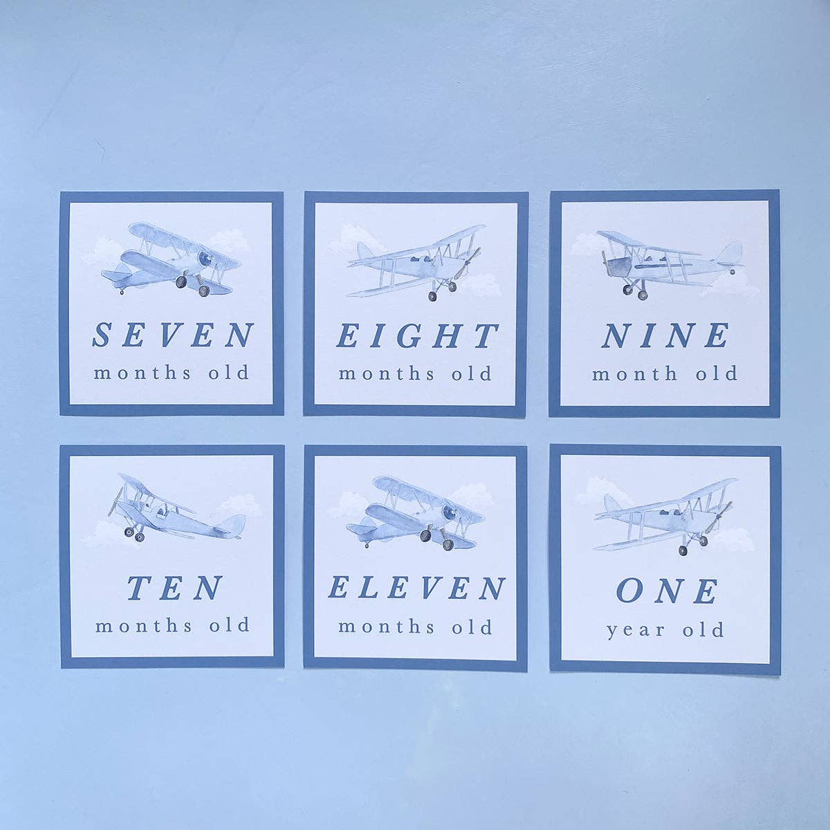 Capture a moment every month of your baby's first year, and highlight your little one's growth with monthly milestone cards. This set features illustrations of vintage blue planes coasting through fluffy clouds set against a pale blue gray sky. These square cards measure 5.25 by 5.25 inches, and each card also contains a space on the back to keep track of special moments and memories.