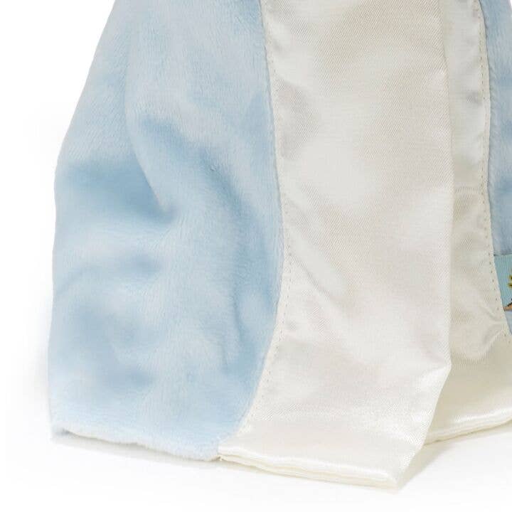 A smaller version of our best-loved Buddy Blanket, this Lovey is ready to be on the go. With a handy loop on the back to attach to the car seat, stroller or crib you're sure to never be left without this precious friend again. This favorite security blanket is a plush floppy eared bunny with handcrafted, baby-safe embroidered face and a snuggly soft blue velour split blanket, lined and edged in silky satin. Signature three carrot tag for little one's fingers.