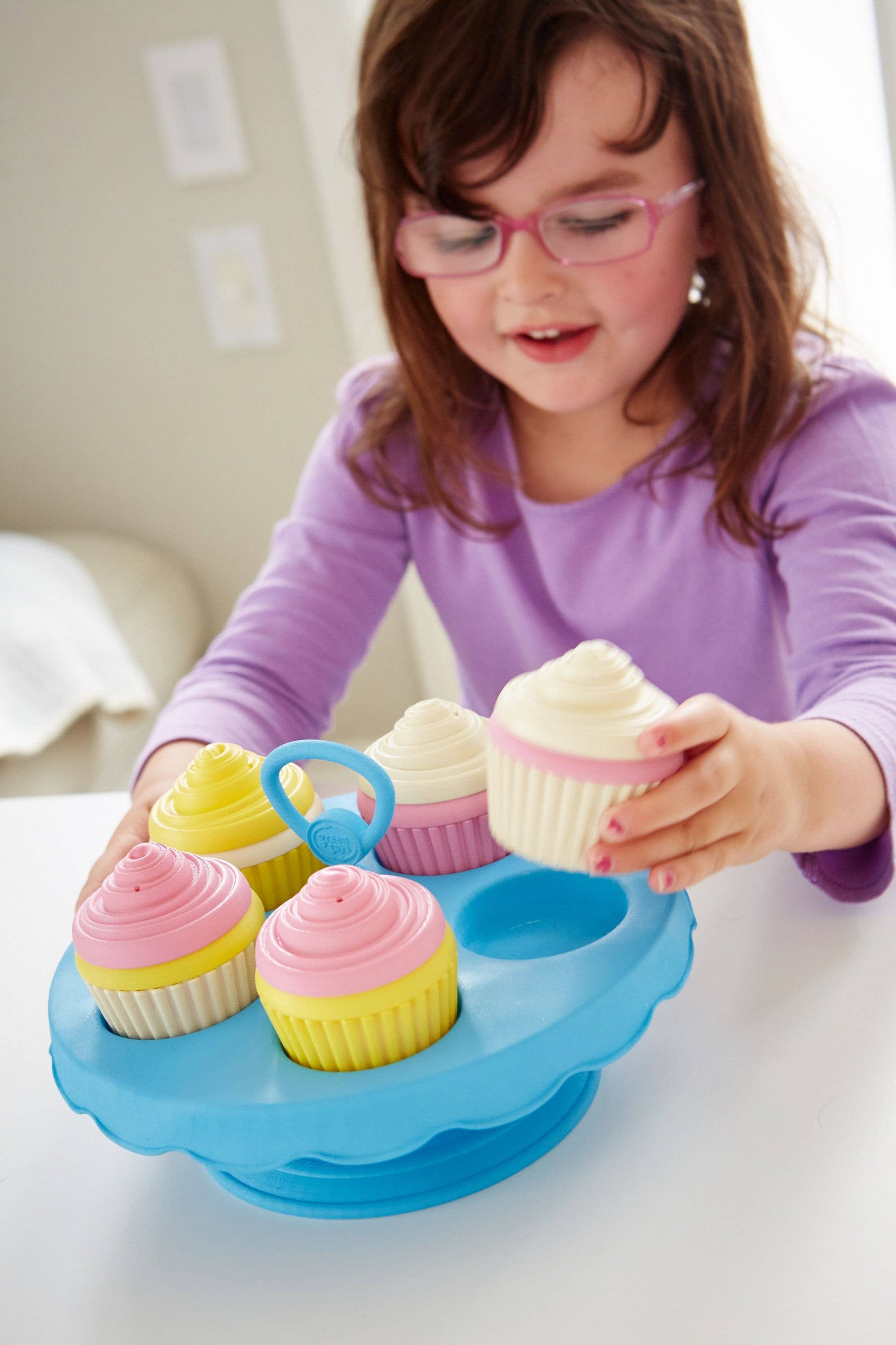 Whip up a batch of sweet treats full of imagination with the Green Toys™ Cupcake Set! Little bakers can practice colors and counting, develop fine motor skills, and host make-believe parties for their stuffed animals and friends. This 16 piece mix-and-match set includes frosting, cakes, and cupcake liners for 5 complete cupcakes, plus a cake stand display. The cake stand is perfect for presentation and storage, and can even be used to serve actual cupcakes. Made in the USA from 100% recycled plastic with no BPA, phthalates, or PVC. Cupcake pieces are dishwasher safe. Meets FDA food contact standards. Packaged with recycled and recyclable materials printed with soy inks.