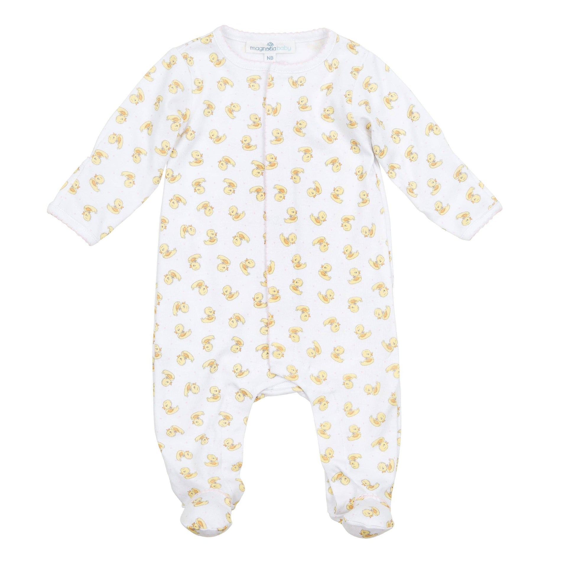 Wrap your little one in pure sweetness with this adorable pink printed footie from the Darling Ducklings collection by Magnolia Baby. Made from the softest Pima cotton, this footie is a breathable dream for delicate skin, ensuring peaceful sleep and happy playtime. The delightful print features cheerful ducklings waddling amidst pink polka dots.