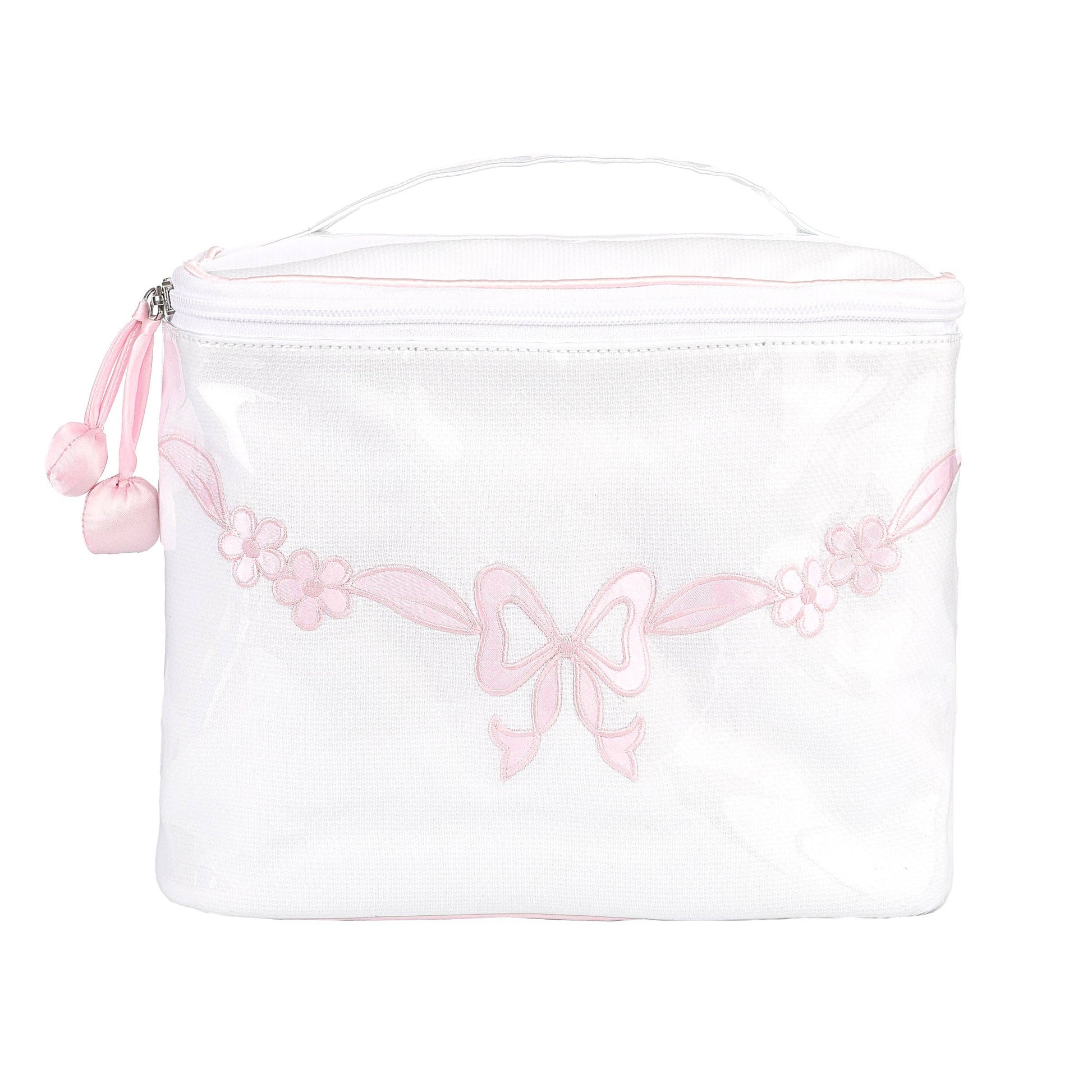 Our Floral Bow Train Case exists at the intersection of beauty and practicality. Beautifully Embroidered with delicate fern leaves, the stylish case features ample storage space and even includes pouches along the sides to safely and securely hold all your make-up, skincare, covered in a plastic material for easy cleaning, and other beauty essentials on your next getaway.