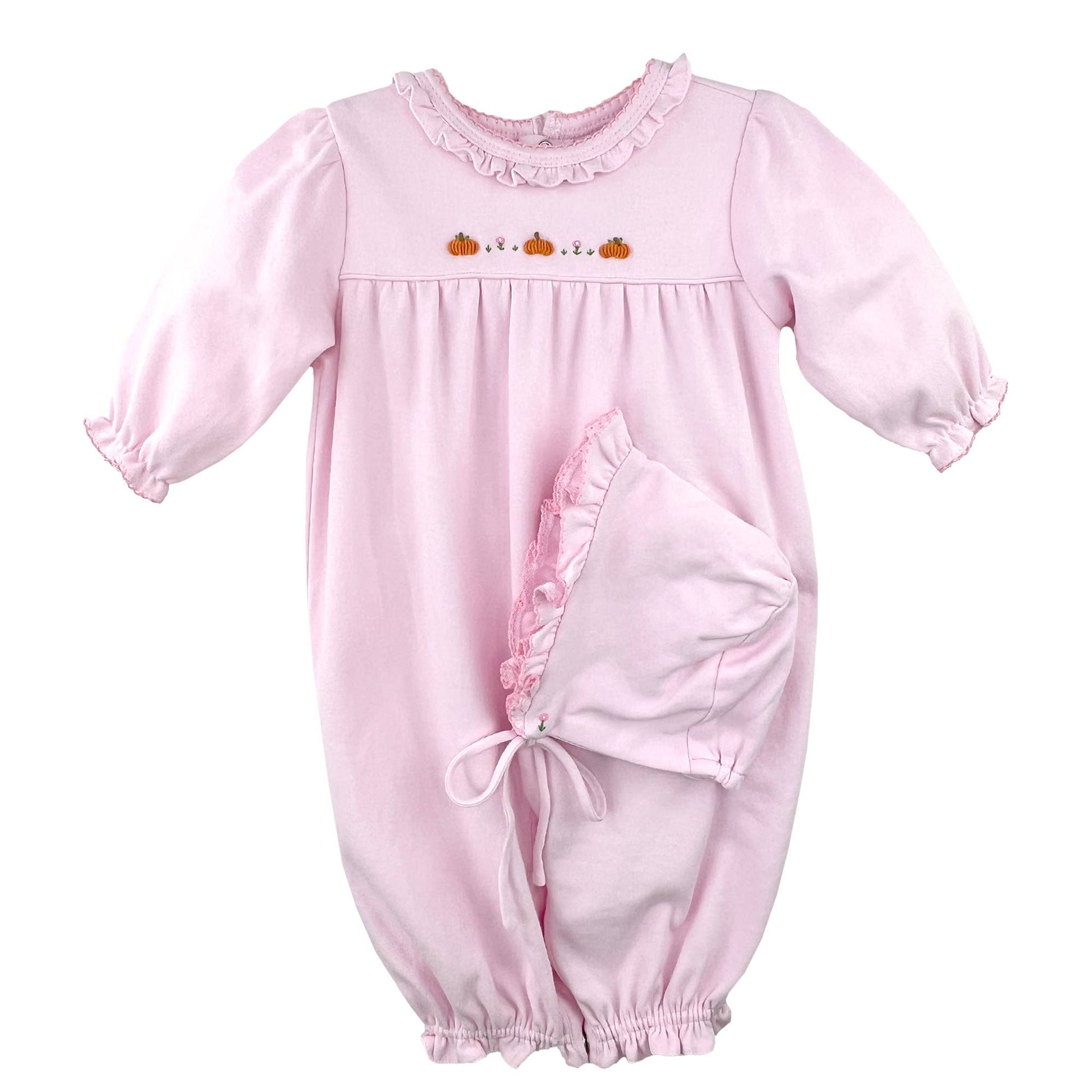 Featuring a delicate bullion embroidered pumpkins that is perfect for babies first trip to the pumpkin patch. Comes in a soft and delicate light pink fabric with sweet ruffled trim for added detail. This 100% cotton knit bag converts with snaps into a longall for two outfits in one. A matching hat is also included.