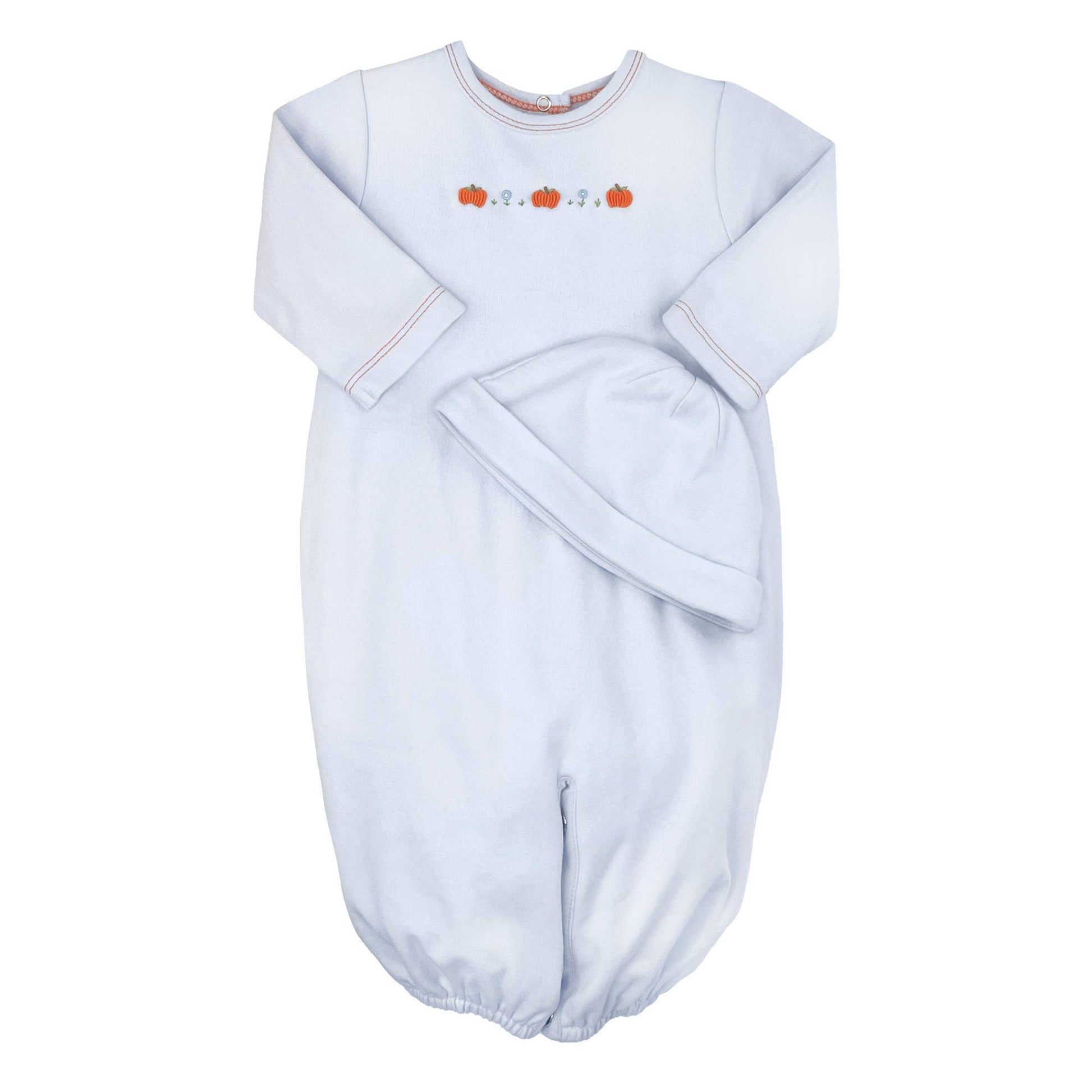 Featuring a delicate bullion embroidered pumpkins that is perfect for babies first trip to the pumpkin patch. Comes in a soft and delicate light blue fabric with red stitching on the trim for added detail. This 100% cotton knit bag converts with snaps into a longall for two outfits in one. A matching hat is also included.