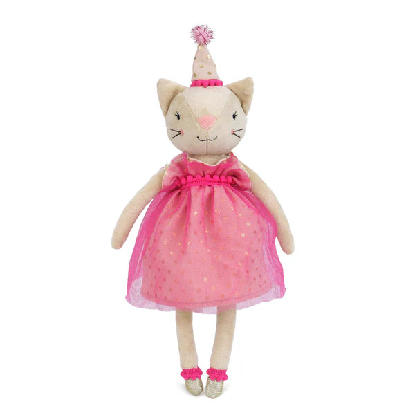 Meet Pia Party Kitty! the life of every celebration! Dressed in her sparkly pink party dress and adorable matching party hat, she's always ready for a fun time. With her sweet whiskers and soft body, Pia is the perfect companion for little ones who love to dance, twirl, and play. Whether it is a tea party, birthday bash, or just everyday fun, this charming kitty is here to bring smiles and giggles wherever she goes. With Pia Party Kitty by your side, every day is a purrfect occasion!