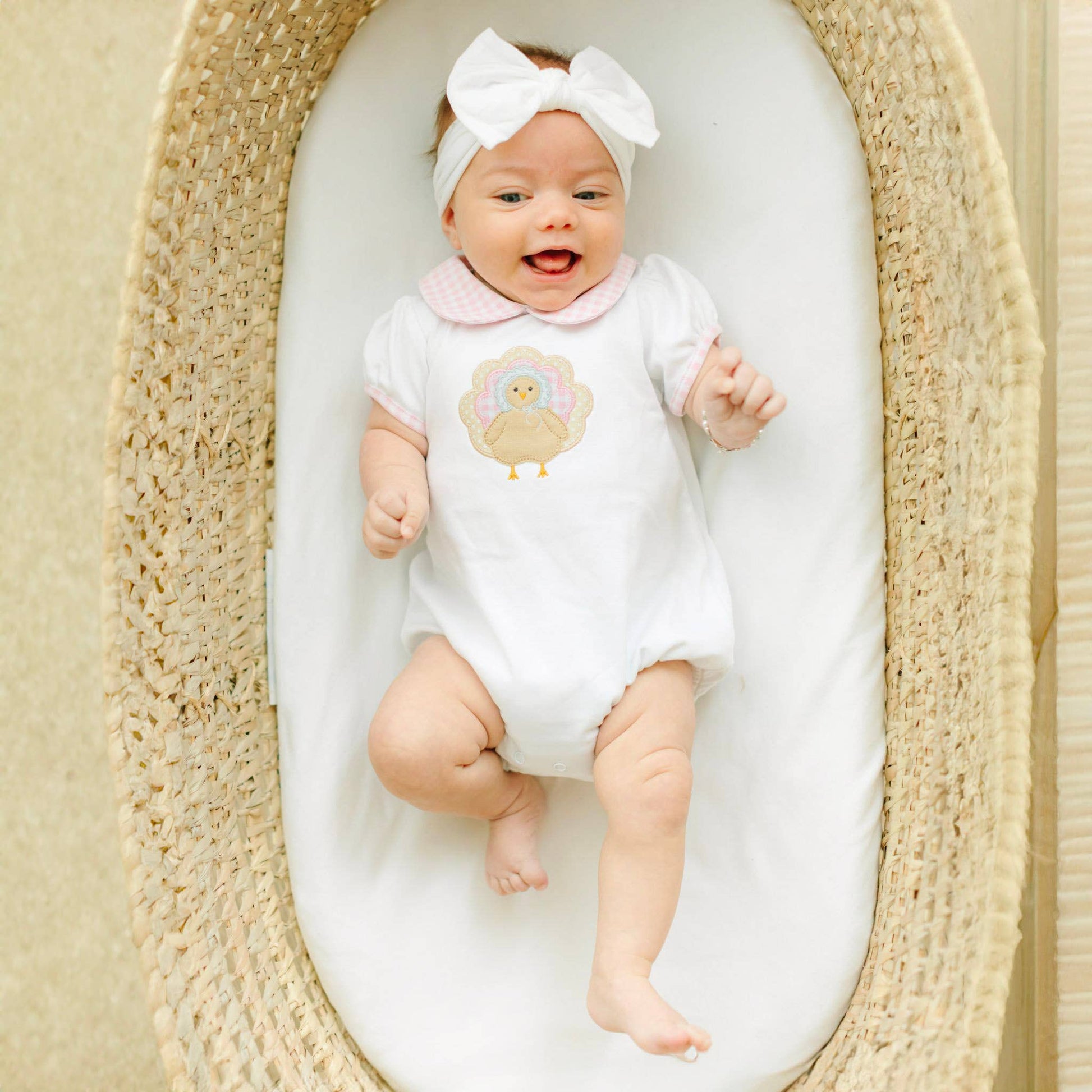 Celebrate Thanksgiving in adorable style with our Pilgrim Pals Applique Collared Short Sleeve Bubble! Inspired by the Thanksgiving holiday and the imagery of Pilgrims and the fall harvest, this charming one-piece features a delightful turkey appliqué on luxurious Pima Cotton, perfect for your little girl.