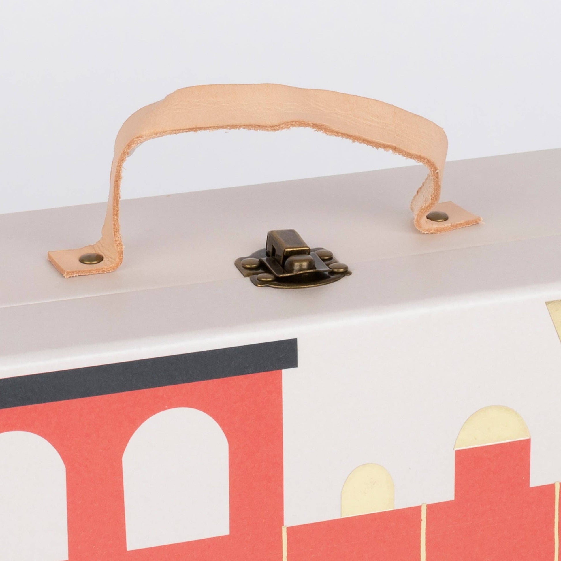 * The suitcase has a leather handle and a burnished brass closure