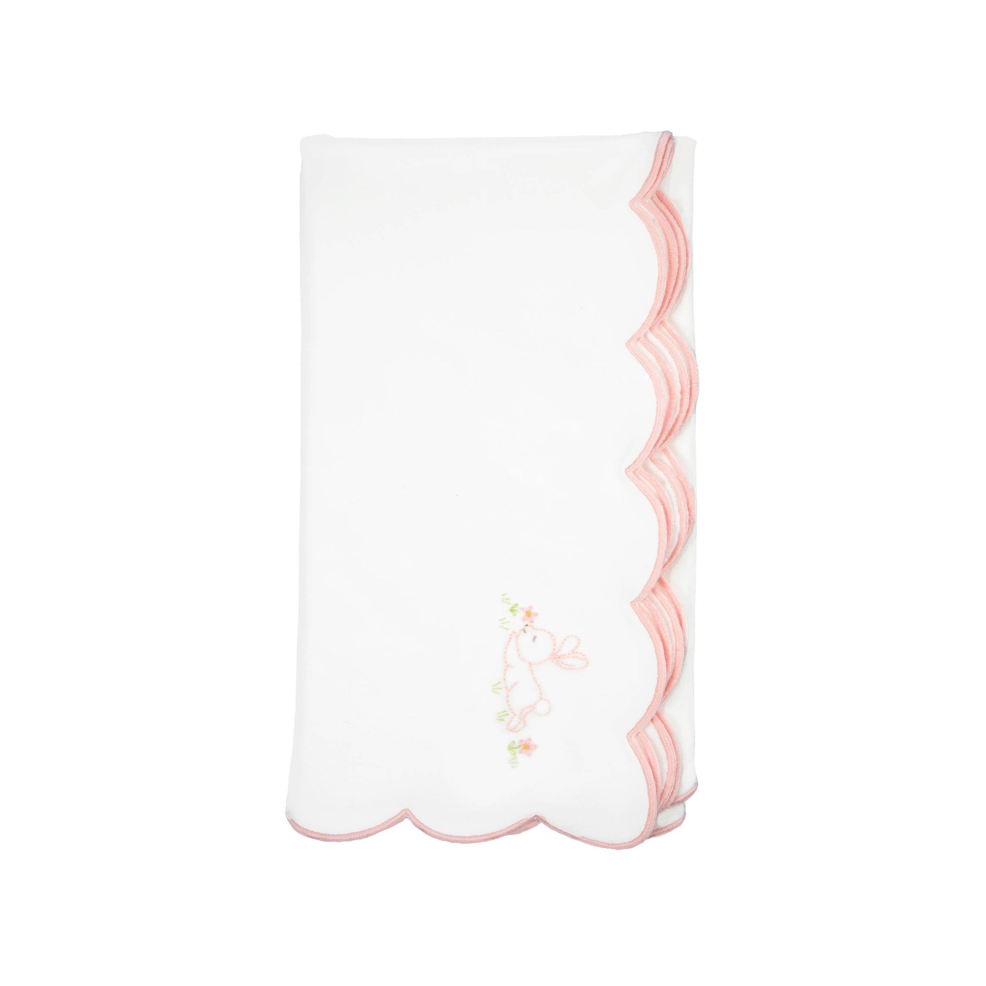 Scalloped knit blanket with hand embroidered bunnies.  On one side the bunny is asleep and on the opposite corner the bunny is awake.