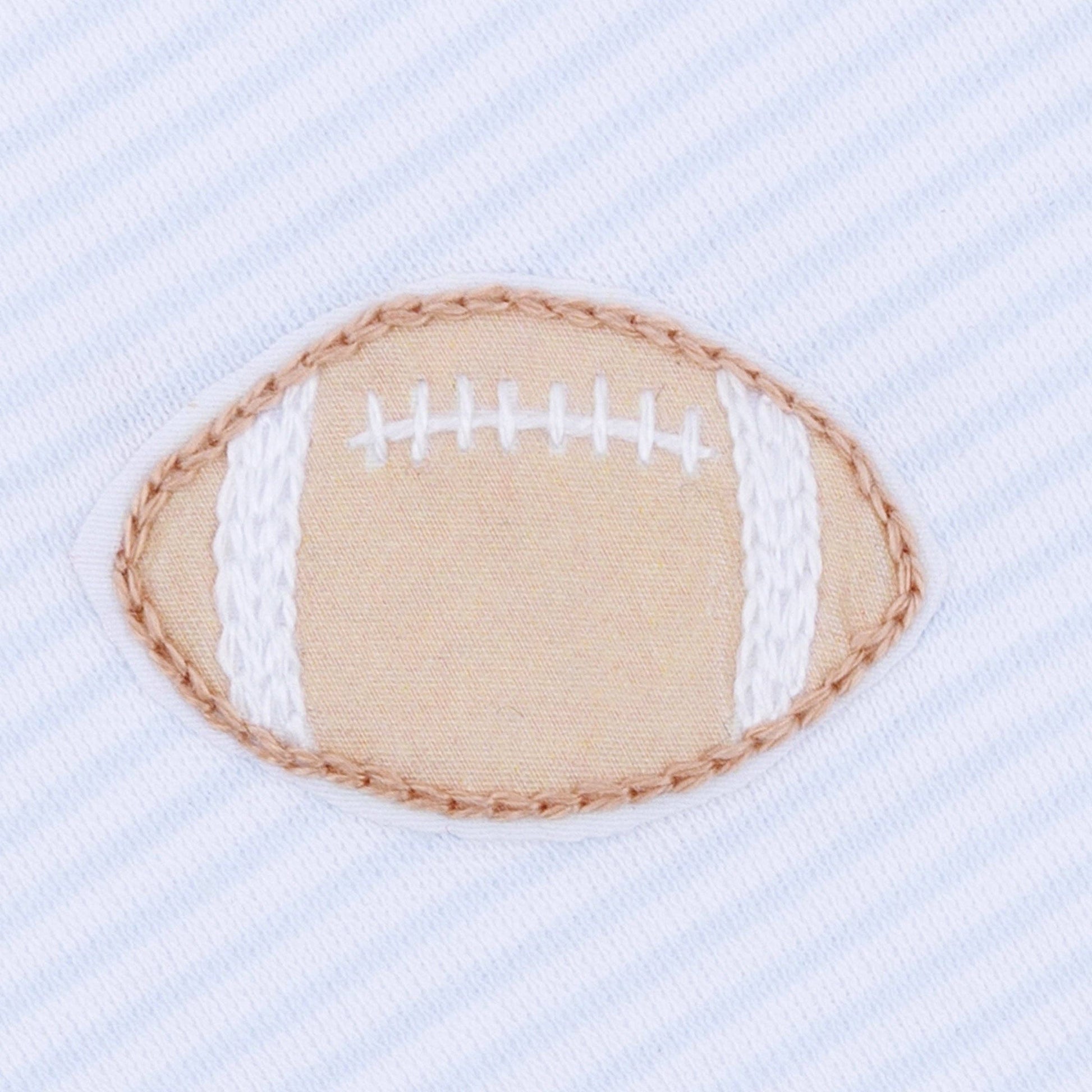 Score big on comfort with our adorable Touchdown Cutie Embroidered Footie! Crafted from luxurious Pima Cotton, this charming light blue footie features a hand-embroidered American football, perfect for your little boy's dream team.